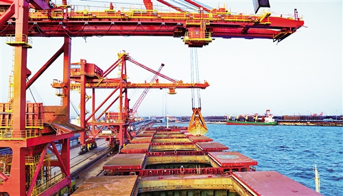 一艘轮船靠泊在秦皇岛港矿石码头卸载。记者从河北省交通运输厅港航管理局获悉,2017年该省秦皇岛港、唐山港和黄骅港三大港口共完成货物吞吐量达10.9亿吨,比上年增长1.4亿吨,创历史新高。新华社记者 杨世尧 摄
