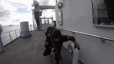 另一组陆战队员搭乘舰载小艇快速接近商船,并展开登临搜捕。