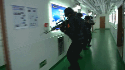 在解救人质的同时,突击小组对动力、通信等重要舱室展开搜索排查,摸清海盗所在位置后,迅速将其制服。
