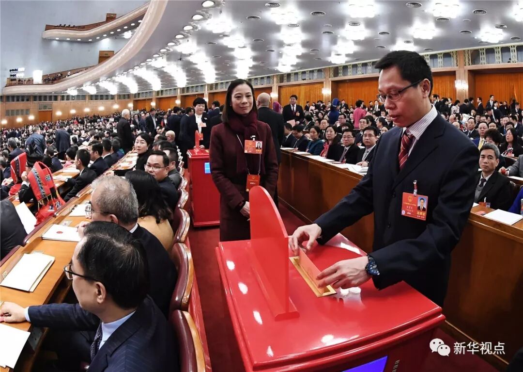 3月11日,十三届全国人大一次会议在北京人民大会堂举行第三次全体会议。这是代表投票表决中华人民共和国宪法修正案草案。新华社记者 饶爱民 摄