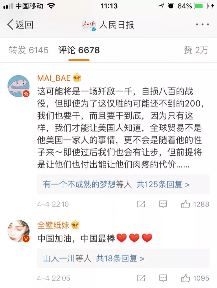 有意思的是,在中国国内同仇敌忾的时候,特朗普昨天晚些时候发了一条推特,明确表示,现在跟中国没有打贸易战,虽然没说要不要跟中国打贸易战,但从调门上来看,明显有所和缓。而今天上午传来消息,美国商务部长罗斯表示,中国的反应不应该让所有人感到意外,中美之间不是“第三次世界大战”,此举被认为是为了安抚美国国内市场的惊慌情绪。