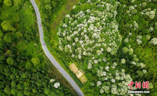 5月1日,江西省新余市的游客车辆穿行于仙女湖区凤凰湾野生泡桐林间。大片泡桐花盛开如雪,令人赏心悦目。赵春亮摄