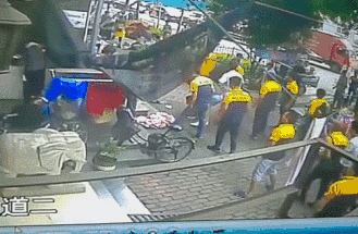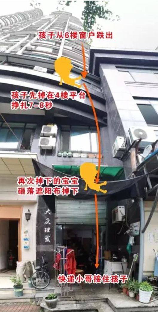 5月22日下午,浙江杭州某小区有个3岁男孩在阳台玩耍,失足从6楼坠落。楼下有个快递网点,刘经理和同事恰好看到孩子从高层跌落,赶快拿被子、床单想救下孩子。