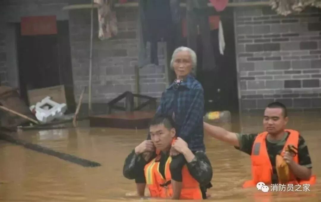 6月8日,受台风“艾云尼”外围影响,江西省泰和县境内普降暴雨,造成水位暴涨,这位老人因左腿有疾行动不便,冲锋舟无法靠近,为了不使她身上被水弄湿,消防战士让其骑在肩上,徒步趟过齐胸深的洪水。