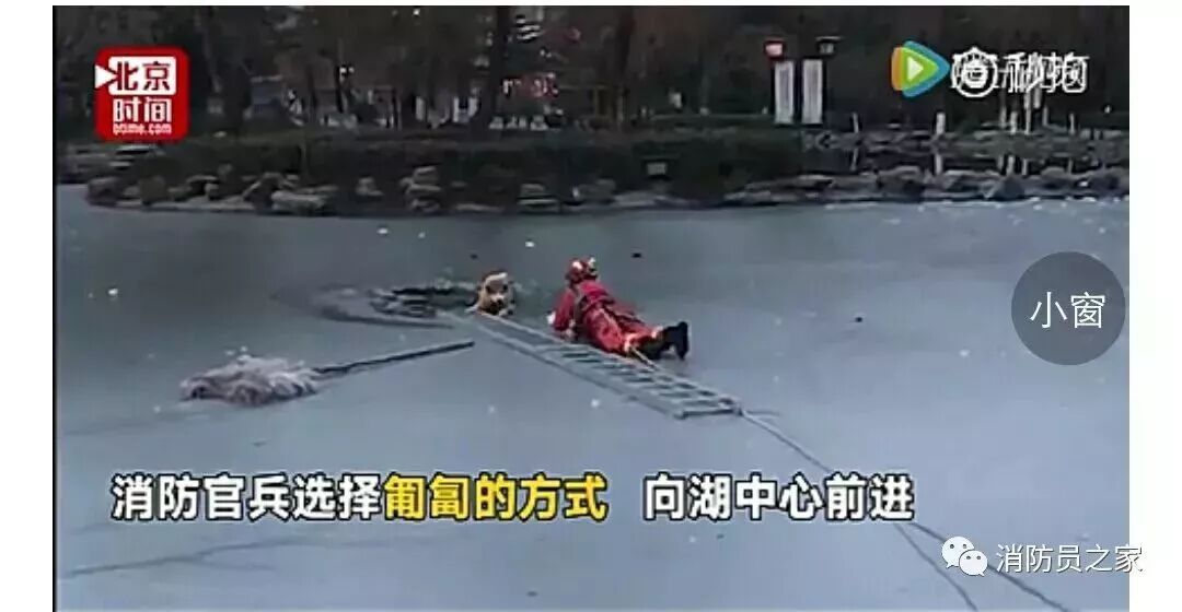 2月7日,陕西西安一只宠物狗被困湖中心的冰窟窿里。消防员身系绳索在冰面上匍匐前进,尽管冰面发生破裂,消防员还是将狗救回岸边。