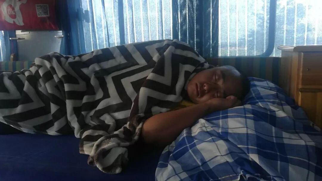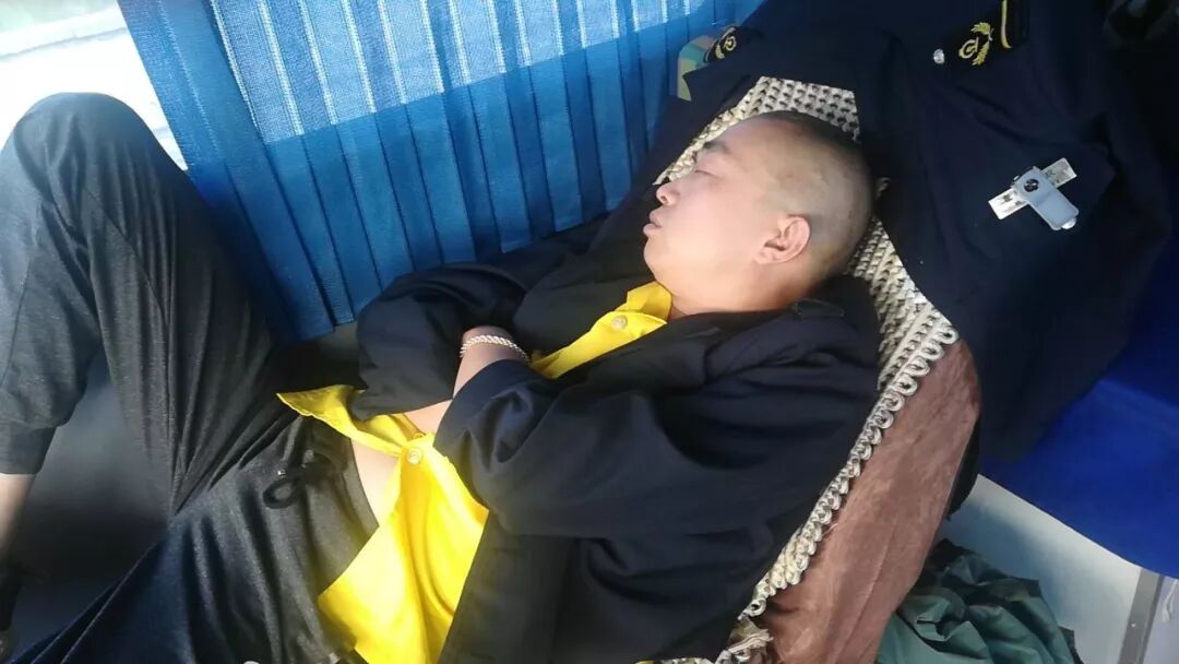 ▲连续多个小时的工作后,陈磊在轨道车床上睡着了