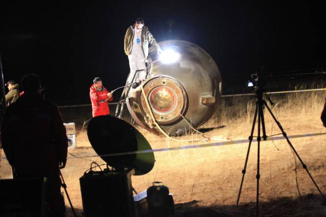 2011年11月17日,神舟八号飞船顺利返回地面,神八飞船返回舱在内蒙古四子王旗着陆。这是工作人员在现场处置飞船返回舱。新华社记者李刚摄