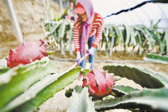 11月19日,固原市原州区头营镇胡大堡村火龙果农庄设施温棚中,农户正在为火龙果施肥。据了解,该农庄通过土地流转、劳动雇用、安置扶贫、产业带动等多种形式,直接带动50户农民户均年增收5万元。记者 马楠 党硕 摄