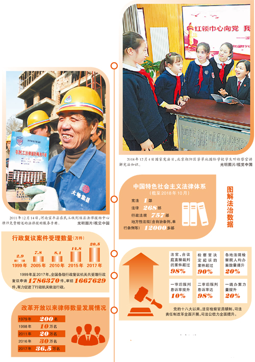 伴随着改革开放的不断发展和深入推进,中国法治建设走过了波澜壮阔的40年历程,取得了前所未有的成就。改革开放40年的历史,是中国法治不断变革、日趋完善和持续发展的光辉历史,是党领导人民走上法治道路、建设中国特色社会主义法治体系、建设社会主义法治国家的光辉历史。