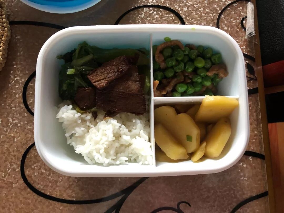“今天给她做了两素一荤一汤”,记者看到装好的盒饭里,有煮软烂的牛肉、豌豆炒肉丝、油麦菜、番茄鸡蛋汤。
