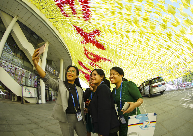 几名东盟客商在会展中心的彩旗下自拍。 广西日报-广西云客户端记者 周军/摄