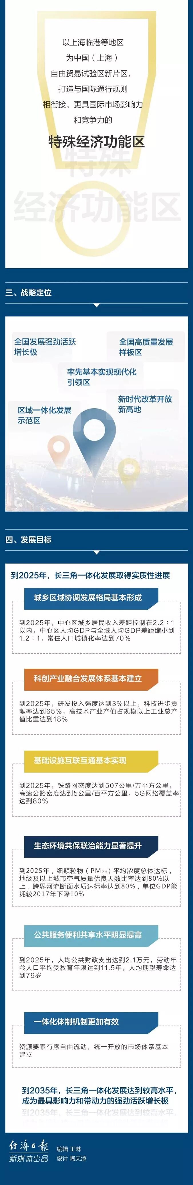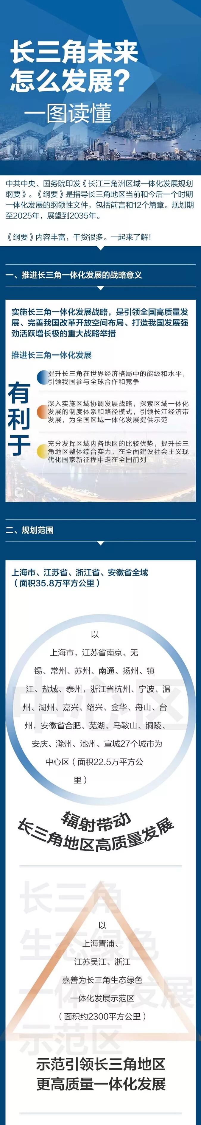 推动长三角一体化发展,是习近平总书记亲自谋划、亲自部署、亲自推动的重大战略。日前,中共中央、国务院印发《长江三角洲区域一体化发展规划纲要》,明确了长三角一体化发展目标。包括到2025年,中心区城乡居民收入差距控制在2.2∶1以内,5G网络覆盖率达到80%,地级及以上城市空气质量优良天数比率达到80%以上等。这份《纲要》干货满满、福利多多,为区域内各地各部门扎实推进工作、创新体制机制、实现更高质量的一体化发展指明了方向。