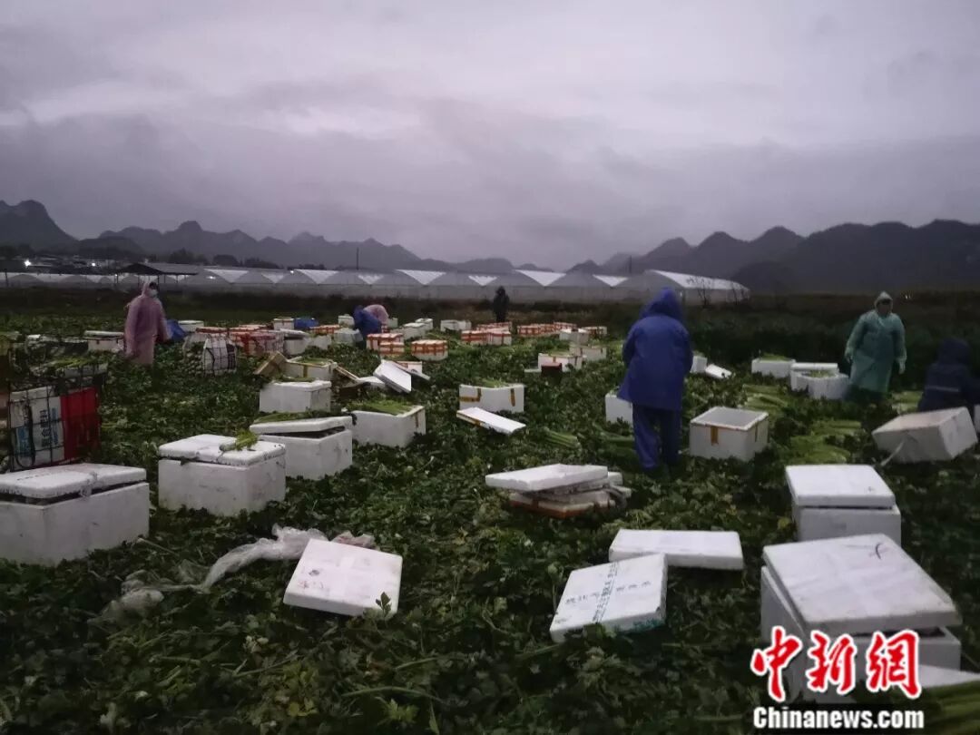 这时,早已等候在菜地里的10多名亲朋好友及工人,甩开膀子开始收割。但天公不作美,毛毛细雨几乎没停过,偶尔还有豆大的雨点来打扰。大家穿着雨衣手里的活没停过,收割、搬运、装箱,没穿雨衣的,有时来不及打伞就拿泡沫箱盖在头上。