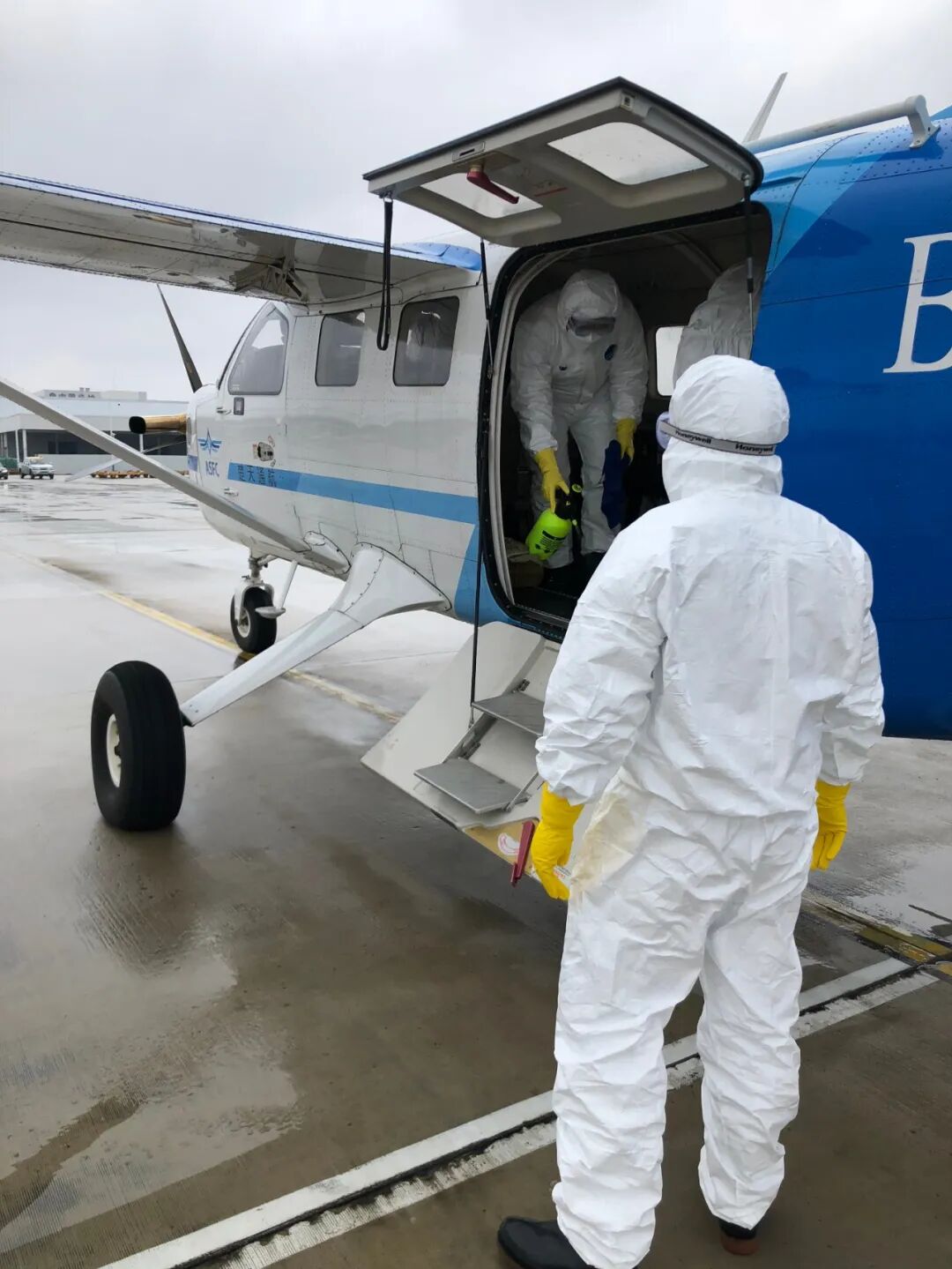 16时38分,陈登攀驾驶大棕熊B-10HF飞机从荆州沙市机场起飞前往武汉,打算在武汉过夜后,第二天运送防疫物资前往合肥。“平时开展跨省作业,飞机调度和准备工作至少需要1天。这次只用了不到5个小时”。