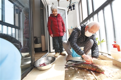 3月19日,武汉市汉阳区四新街道梅林都汇社区,两位老人正在家中打理社区志愿者们刚刚送来的活草鱼。老人说,疫情发生后,老两口一直隔离在家,生活上很多小事情都是社区帮着解决,日子过得很平稳,身体也很好,请大家放心。