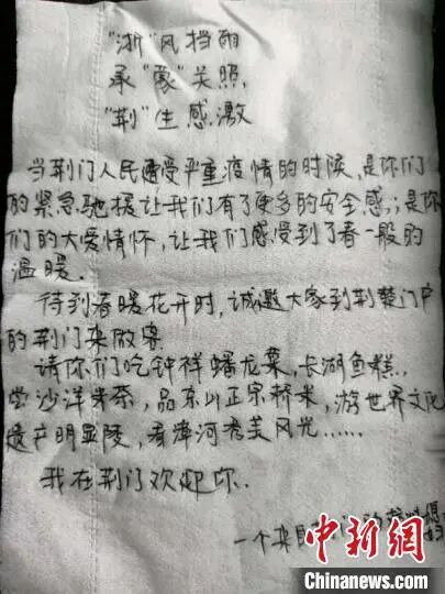 “‘浙’风挡雨、‘荆’生感激,待到春暖花开时,诚邀大家来荆门做客……”这是杨花写在纸巾上的一段话,三张纸巾里,字里行间透露着她对集中观察点工作人员的感激之情。