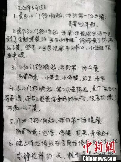 3月15日,感受了一天的隔离生活,杨花把一整天的测温、伙食等内容都写在了纸巾上,作为她的隔离日记。对于隔离初体验,杨花写下:“安静规律的一天,杭州最美的城市。”