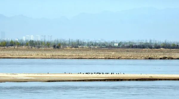 4月4日,野生鸟类在黄河外滩国家湿地公园滩涂上栖息。