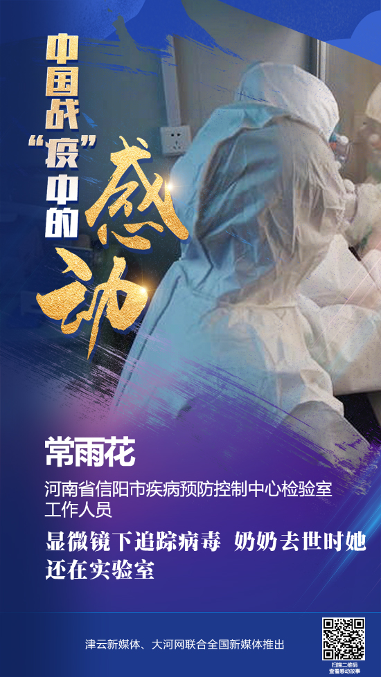1994年出生的常雨花是河南省信阳市疾病预防控制中心检验室工作人员,从事病原微生物检测工作。疫情发生后,她负责新冠病毒核酸检测工作。显微镜下追踪病魔,需要非常细致准确,精准判断,任何一个环节有疑问都要重新检测。 奶奶去世时她还在实验室。“没有一个冬天不可逾越,没有一个春天不会来临。”