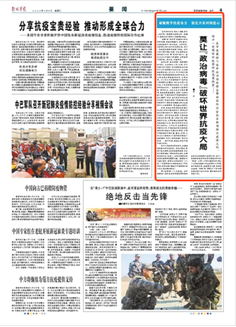 当前,抢救生命是国际社会最大的关切,任何分散抗疫合力、影响生命救治的舆论和行为,都是对生命的不负责任。面对突发的疫情,中国迅速动员各方面力量,投入抗疫斗争:防疫物资不足时,立即协调企业提高产能;防控经验不足时,展开多种形式的专家交流会议。不仅如此,当疫情在全球蔓延之际,中国积极向有关国家和国际组织提供力所能及的帮助,分享中国经验和中国方案,截至3月底,已向120个国家和4个国际组织提供了物资援助,向多个国家派遣了医疗专家组……雪中送炭、拯救生命是中国的真正关切。