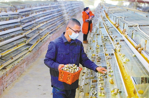 ▼新疆博湖县塔温觉肯乡东大罕村双虎湖鸭养殖农场,员工在捡拾鹌鹑蛋。博湖县把产业扶贫作为实现脱贫成效可持续发展的根本举措,在各乡镇大力培育鹌鹑养殖、蔬菜加工等村级小产业,形成“一乡一品、一村一业”的产业脱贫新格局。 年 磊摄