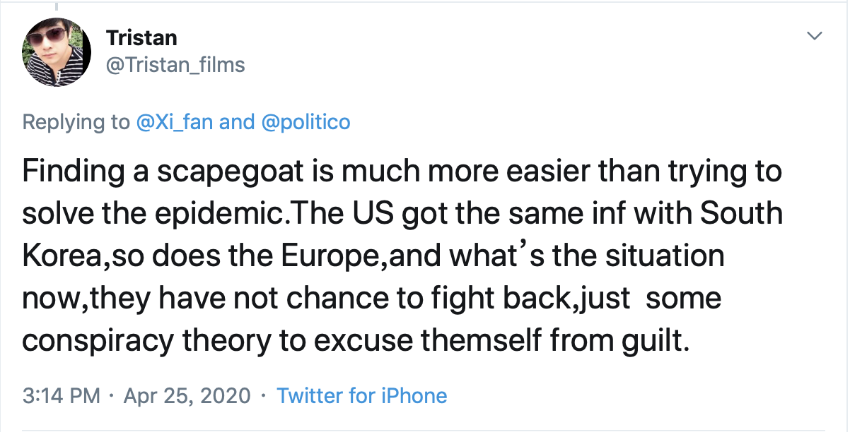 网民:“找个替罪羊比应对疫情容易多了。目前的情况是,美国政府没有能力应对疫情,就找些阴谋论来减轻他们的罪恶。”↓↓↓
