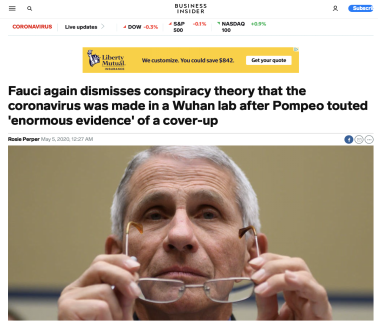 △美国《商业内幕》报道,福奇博士驳斥“病毒系实验室制造”