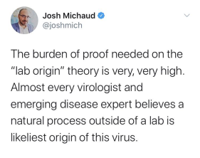 △凯撒家族基金的全球卫生副主任乔希·米肖发推表示:病毒实验室来源说举证负担极重