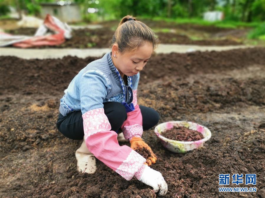 贵州省德江县煎茶镇川岩村村民郎兴英在查看蚯蚓长势(4月21日摄)。新华社记者 汪军 摄