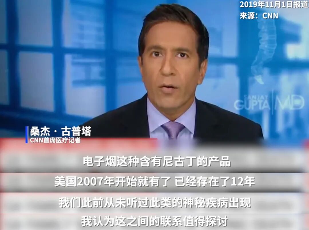 2019年11月,美国有线电视新闻网(CNN)报道了一起疑似电子烟肺病死亡病例,患者玛利亚在去世两个月后仍然无法确定死因是否与电子烟有关。CNN首席医疗记者桑杰·古普塔在连线时表示,美国从2007年开始售卖电子烟,此前从未出现过类似的神秘肺病案例,这两者之间的关系仍然值得探讨。