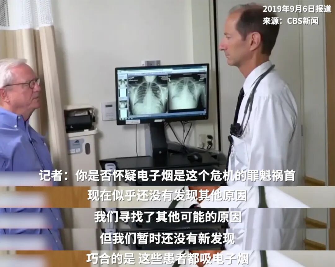 2019年9月,一位治疗过电子烟肺病患者的医生接受美国哥伦比亚广播公司采访时表示,尚未发现有其他致病原因,但凑巧的是患者们都吸电子烟。