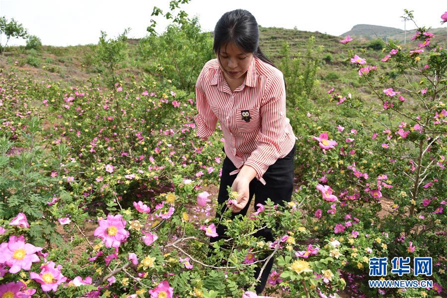 蜜蜂在花间飞舞,阳光照射下,刺梨花映红了山野。