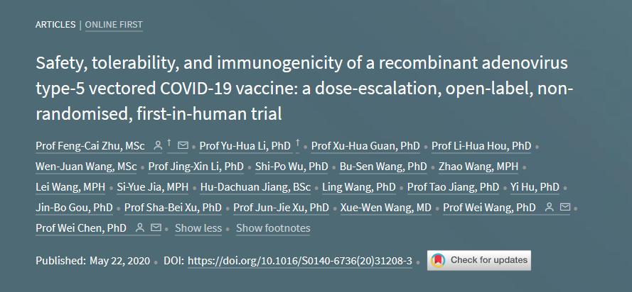 5月22日,世界权威医学期刊《柳叶刀》在线刊登军事医学研究院陈薇院士、江苏省疾控中心朱凤才教授团队的新冠疫苗人体试验临床数据结果。(图源:《柳叶刀》官网)