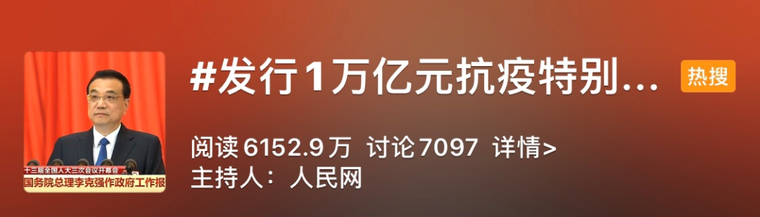 今年的政府工作报告提出,今年赤字率拟按3.6%以上安排,财政赤字规模比去年增加1万亿元,同时发行1万亿元抗疫特别国债。这是特殊时期的特殊举措。上述2万亿元全部转给地方,建立特殊转移支付机制,资金直达市县基层、直接惠企利民。