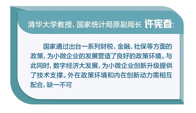 清华大学教授、国家统计局原副局长许宪春表示,新冠肺炎疫情暴发以来,国家通过出台一系列财税、金融、社保等方面的政策,为小微企业的发展营造了良好的政策环境。与此同时,数字经济大发展,为小微企业创新升级提供了技术支撑。外在政策环境和内在创新动力需相互配合,缺一不可。