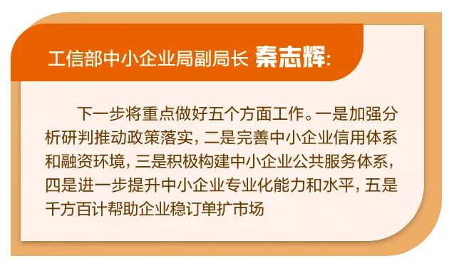 秦志辉表示,针对中小微企业复工复产中的难点痛点,下一步将重点做好五个方面的工作。一是加强分析研判推动政策落实。二是完善中小企业信用体系和融资环境。三是积极构建中小企业公共服务体系。四是进一步提升中小企业专业化能力和水平。五是千方百计帮助企业稳订单扩市场。