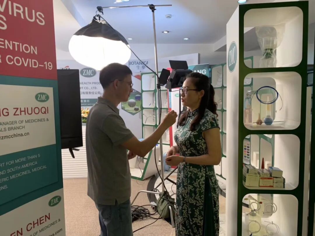 记者张国亮首先带领观众身临其境地观摩了浙江省医药保健品进出口有限公司以原有样品间改造升级的广交会直播间,展示了公司在云上广交会展馆推出的VR虚拟现实展厅,随后采访了公司党总支书记、总经理王巧群。