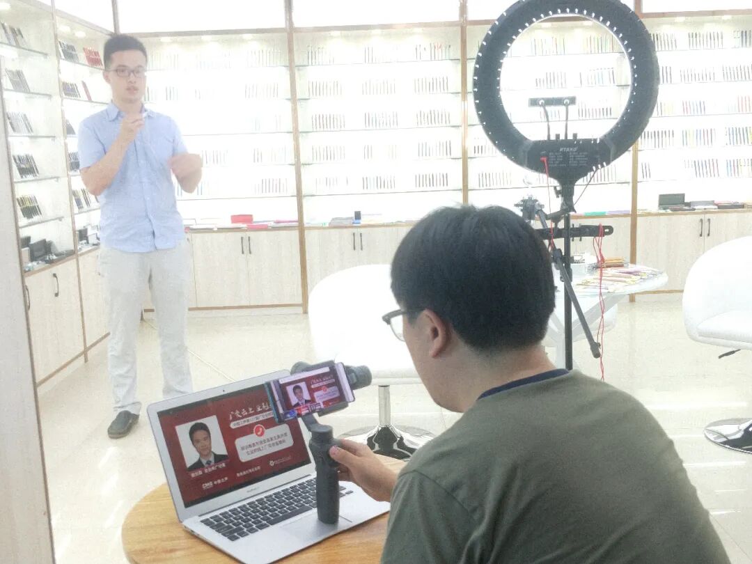 总台央广记者谢元森在凯龙文具礼品有限公司的广交会直播间直播采访