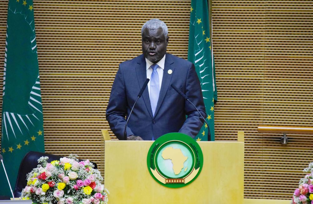 2月9日,在埃塞俄比亚亚的斯亚贝巴,非盟委员会主席法基在非盟首脑会议上发言。新华社发(迈克尔摄)