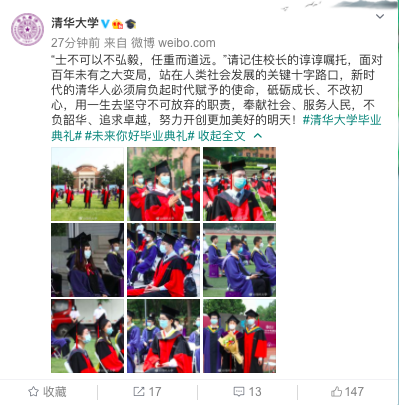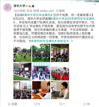 六月的水木清华,云影澹荡,荷叶田田。由于疫情影响,今天,我们举行清华历史上第一次“云上”毕业典礼。我相信,这场特殊时期的毕业典礼对所有同学都具有特殊的意义,一定会给你们留下终生难忘的记忆。我代表学校,向经受考验、顺利毕业的同学们表示热烈的祝贺!向关心支持你们的亲友们和付出辛勤汗水的老师们致以衷心的感谢!