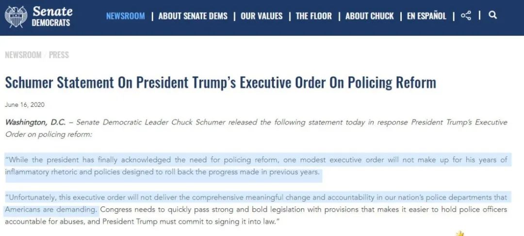 民主党人舒默在一份声明中说,特朗普终于承认了警务改革的必要性,但这一“温和”的政令,无法为美国执法机构带来美国民众所要求的全面而有意义的变革和问责。▲
