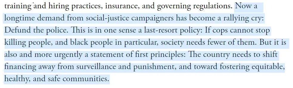 《大西洋月刊》刊文称:主张社会公平的抗议者们一直坚持的诉求成为了当下民众最普遍的呼声:缩减警务开支。这在某种意义上说是最后的选择:如果警察不能停止杀害民众,尤其是非裔,那么我们的社会就不需要这么多警察。但是这一诉求也陈述了一个基本原理:我们的国家需要减少在监管和惩罚方面的支出,增加对社区的投入,使其更加公平、健康与安全。▲