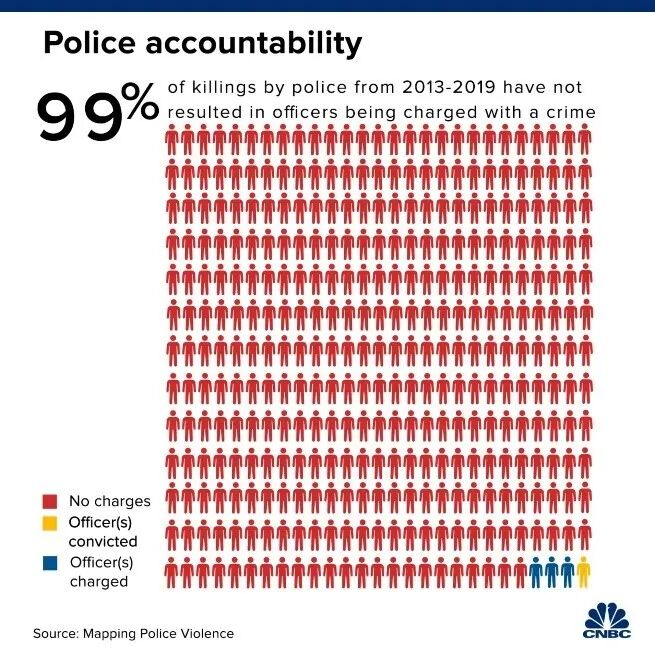 CNBC:研究机构数据还显示,虽然2013至2019年期间美国警察暴力执法致死案件的数量高居不下,但是99%的案件却能免于被起诉追责。▲