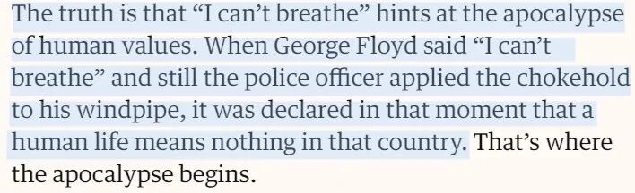 英国《卫报》日前发表文章指出,“我不能呼吸”这句话,意味着人性的泯灭。当弗洛伊德说出这句话时,警察还是死死压住了他的喉咙,这个瞬间等于宣布:人命在这个国家不值钱。▲