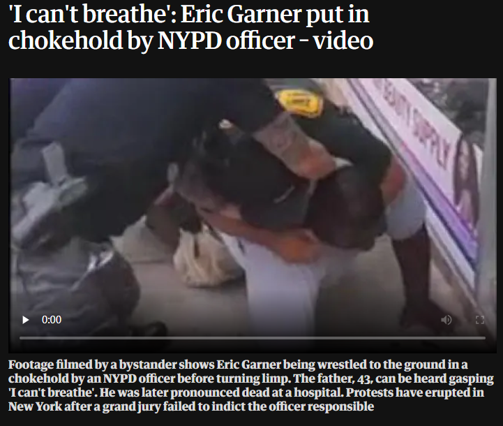 英国卫报(the Guardian)报道,路人拍摄的视频中,43岁的非裔商贩Eric Garner被数名警察按倒在地“锁喉”时曾说:“我不能呼吸”。他被送到医院不久后去世,而涉事警察并未被追究责任,随后纽约爆发了游行抗议。▲