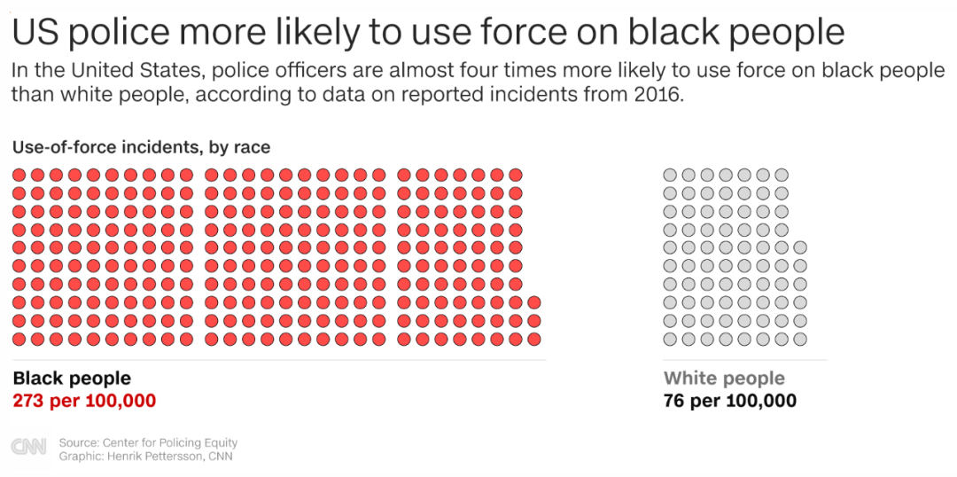 CNN分析美国警务平等中心(Center for Policing Equity)2016年以来的数据发现,黑人比白人更容易遭到警察暴力执法,这一比例倍数接近4倍。▲