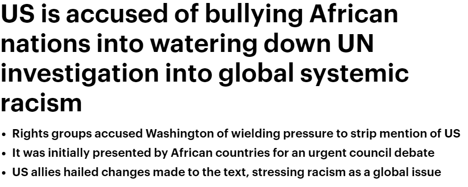 《英国每日邮报》报道称美国胁迫非洲国家,放弃了对全球系统性种族歧视的调查。▲