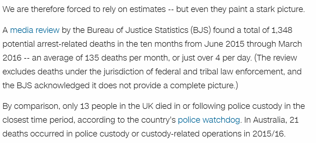 CNN:美国司法统计局2016年公布的一项评估发现,2015年6月至2016年3月,美国共发生了1348起与逮捕相关的死亡事件——平均每个月135例,每天超过4例。(该数据不包括联邦与部落执法管辖范围内的案件,该机构还承认这一数据无法反映美国国内全貌。)