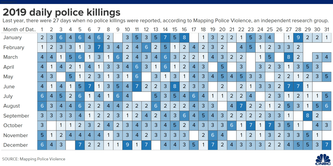CNBC:一个名为警察暴力执法地图(Mapping Police Violence)的研究机构,发布了多项有关美国警察执法工作的数据,结果显示2019年全美有近1100人因警察暴力执法而死,即平均每天就有3个美国人死在警察手中。▲(方格中的数字代表当天统计的死亡人数)