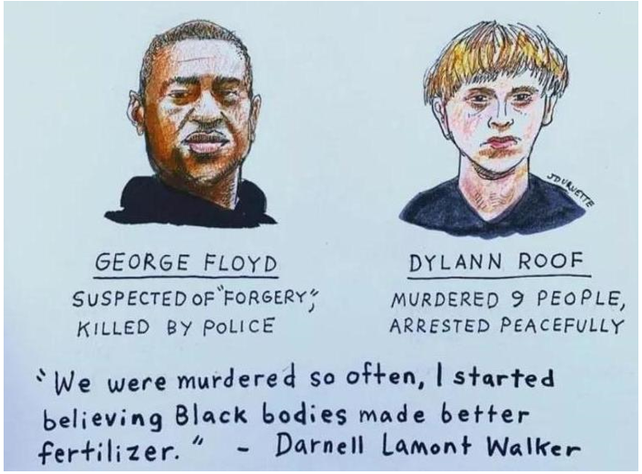 图中的黑人和白人形成鲜明对比,黑人因涉嫌“用假币”被警察用致命武力抓捕,而另一个白人是谋杀9人的连环杀人犯,却被警察用温和手段拘捕。漫画底部引用了美国黑人导演、民权活动家达内尔·沃克的名言:“我们总被谋杀,我都开始怀疑,是不是因为黑人的身体更适合做肥料?” ▲
